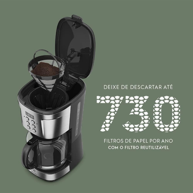 - O filtro permanente e o porta filtro removível ajudam a evitar o descarte de filtros de papel, sendo uma opção mais ecológica.
